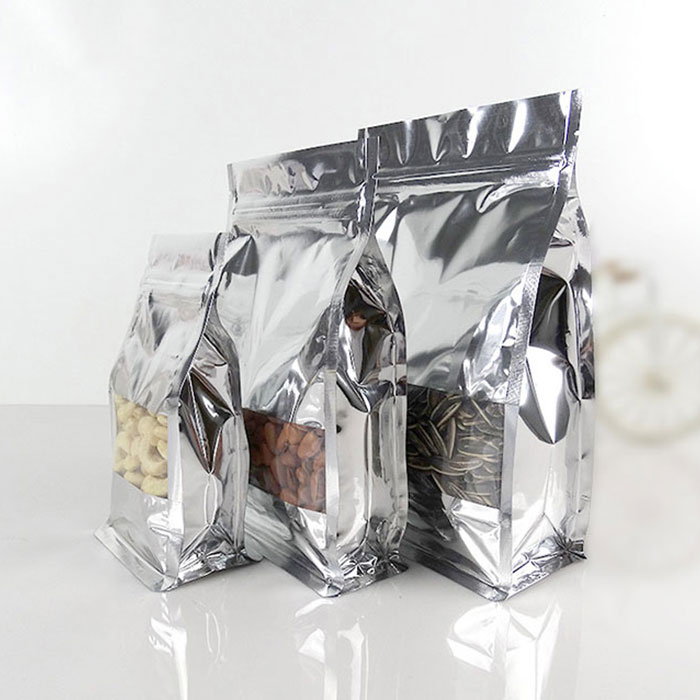 ◉ Алуминијумска торба са патентним затварачем са равним дном са прозором, торба са равним дном се такође назива торба са квадратним дном или торба са блоком, то је врста модних кеса за паковање. Ламинатни филм обложен алуминијумом чини савршену баријеру, спречава ерозију ваздуха, светлости и течности итд.